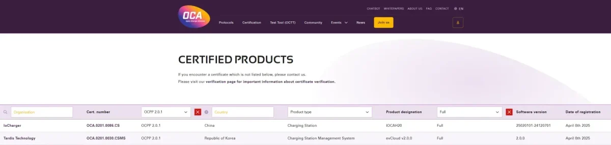 On April 8th, 2025, IoCharger officially obtained the OCPP 2.0.1 Full Profiles Certification from the OCA and is now the world’s 1st OCPP 2.0.1 Fully & ISO15118 certified EV Charging Solution provider.